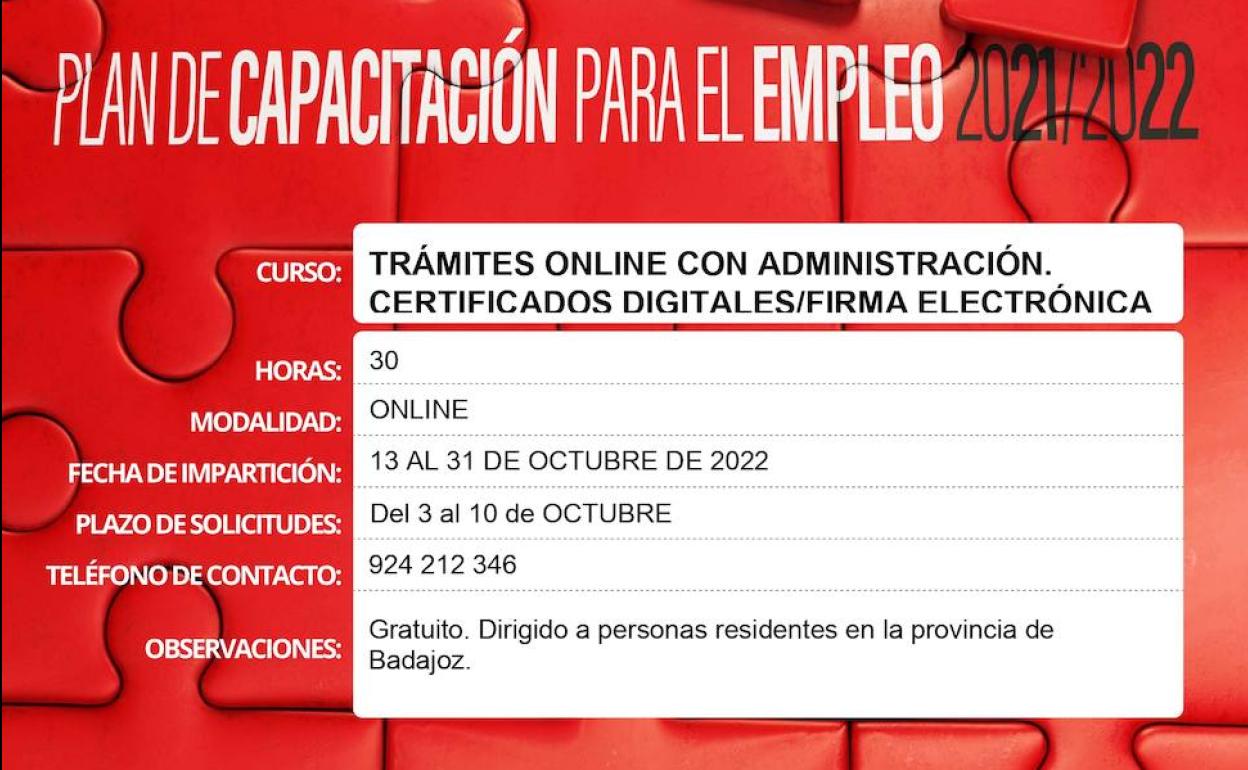 La Diputación de Badajoz, a través del Plan de Capacitación para el Empleo 2021-2022, desarrollado por el Servicio de Capacitación para el Empleo, dependiente del Área de Desarrollo Rural y Sostenibilidad, va a iniciar la tercera edición de la acción formativa en 'Trámites online con la administración. Certificados digitales y firma electrónica'.