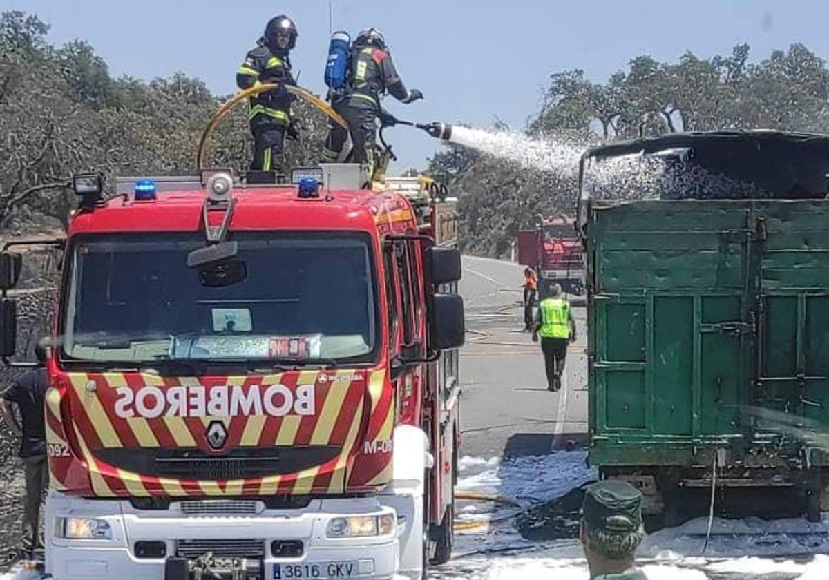 Arde un camión portugués con chatarra en la carretera EX-112 Villanueva-Oliva