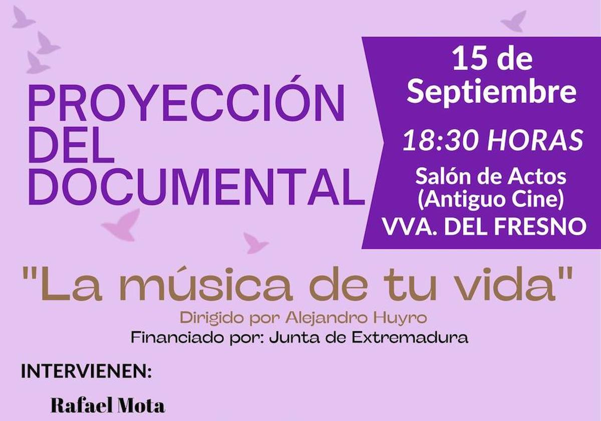 El documental 'La música de tu vida', producido por la Asociación Española Contra el Cáncer, Badajoz Ciudad Compasiva y Músicos Solidarios sin Fronteras bajo la dirección de Alejandro Huyro se proyectará en la localidad.