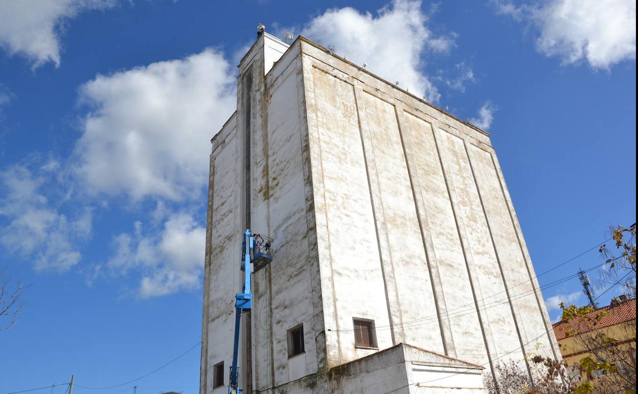 El antiguo almacén de piensos, Silo, está en proceso de recuperar su imponente figura blanca impoluta, gracias a las labores de limpieza y pintura que desde el Ayuntamiento se están acometiendo a través de algunos de los exalumnos de la Escuela Profesional de Pintura Industrial y Decorativa en construcción 'Alminar VIII' que se desarrolló en la localidad en 2019.