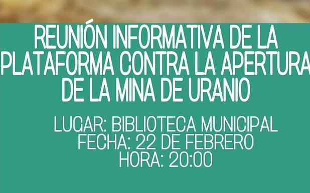 La lucha contra la investigación y posible reapertura de la mina de uranio se canalizará a través de una plataforma, para su constitución y coordinación se realizará una reunión este viernes 22 de febrero a las 20.00h