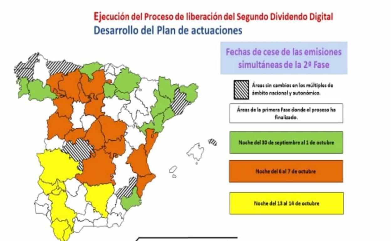 Los municipios en los que todavía se está ejecutando el proceso del Segundo Dividendo Digital están repartidos en 46 provincias de 15 comunidades autónomas (Andalucía, Aragón, Canarias, Cantabria, Castilla y León, Castilla La-Mancha, Cataluña, Comunidad de Madrid, Comunidad Valenciana, Extremadura, Galicia, La Rioja, Navarra, País Vasco y Región de Murcia) y la Ciudad Autónoma de Ceuta.