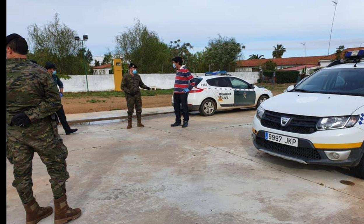 Una serie de militares se han desplegado en el municipio junto a efectivos de la Guardia Civil para efectuar labores de control, el dispositivo ha sido recibido en el recinto ferial por el alcalde de la localidad