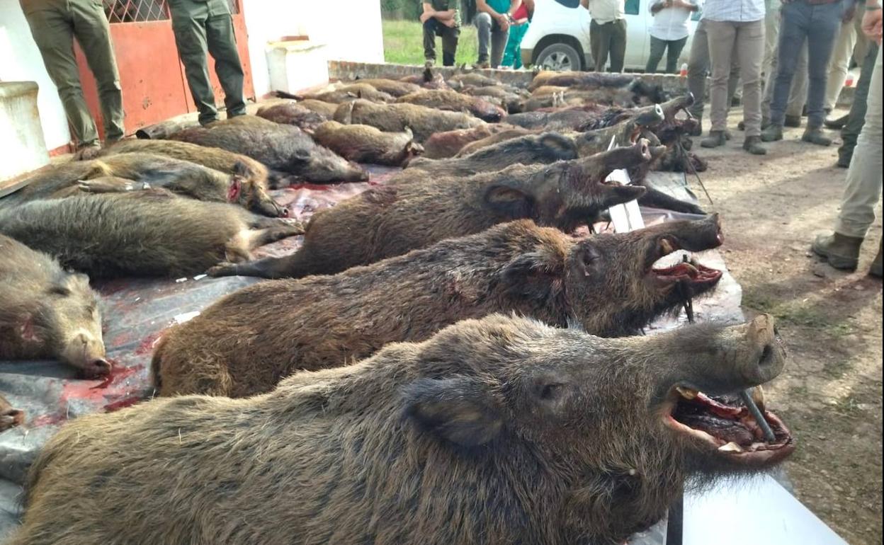 La jornada desarrollada en la dehesa de Las Alcañizas se saldó con el abatimiento de 46 jabalíes el pasado sábado 29 de octubre, en ella se congregaron en torno a 150 personas