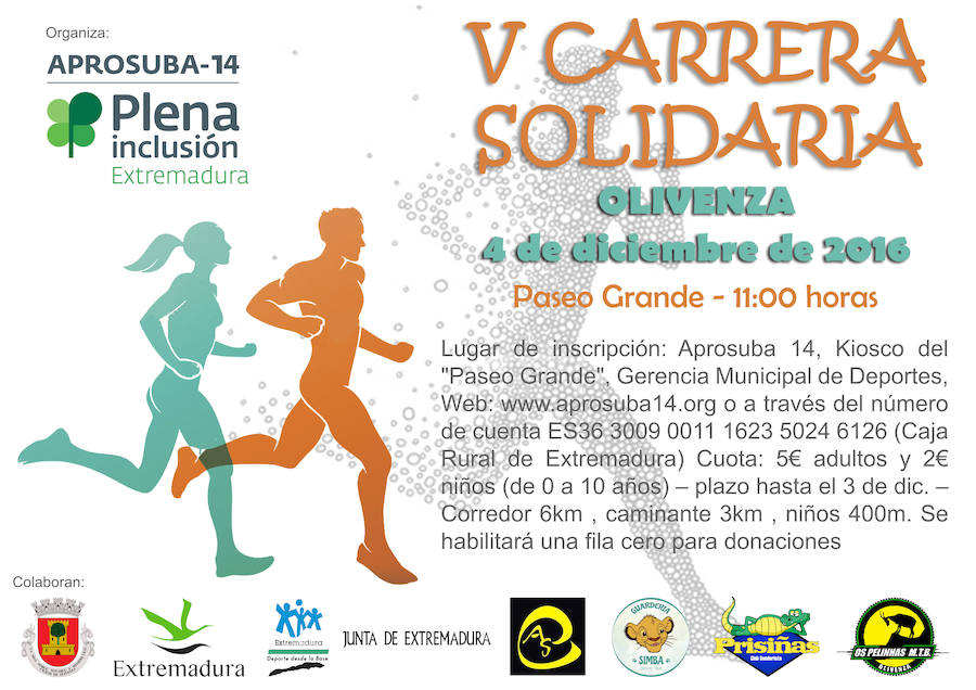 La Asociación Protectora de Personas con Discapacidad Física y Psíquica de la Comarca de Olivenza, Aprosuba 14, la cual acoge a varios usuarios de Villanueva ... del Fresno, ya tiene abierto el plazo de inscripción para su V Carrera Solidaria, que tendrá lugar la mañana del domingo 4 de diciembre por el casco histórico y el entorno de la localidad.