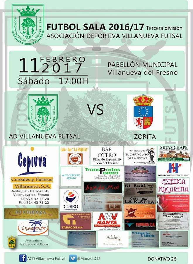 El encuentro perteneciente a la temporada de fútbol sala 2016/17 de tercera división entre el equipo local Asociación Deportiva Villanueva Fútsal y Zorita FS, ... tendrá lugar éste sábado 11 de febrero a las 17.00h en el pabellón municipal.