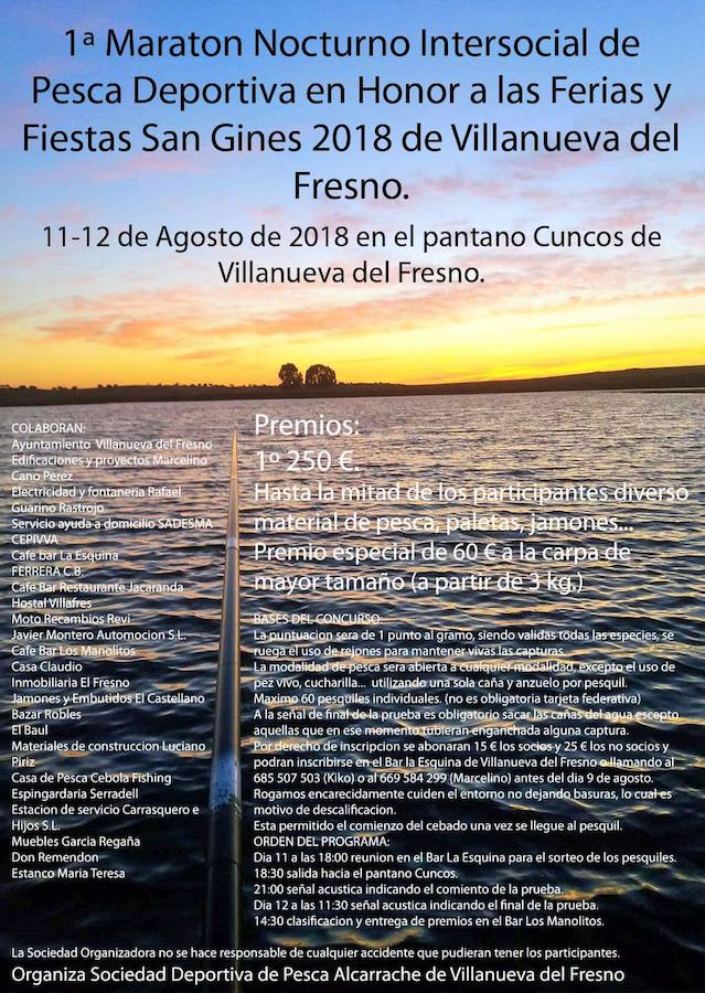 Los días 11 y 12 de agosto se llevará a cabo el I Maratón Nocturno Intersocial de pesca deportiva organizado por la Sociedad Deportiva de ... Pesca 'Alcarrache', con motivo de las Ferias y Fiestas de San Ginés 2018.