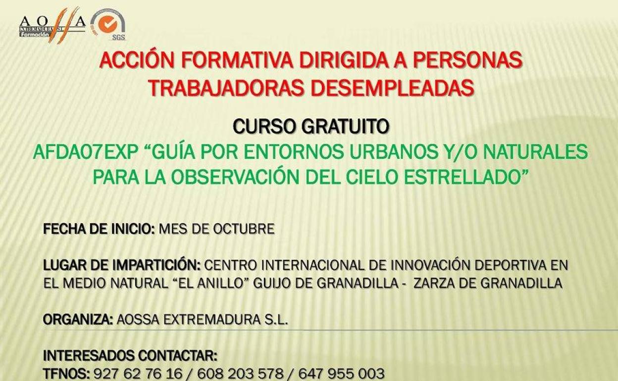 Todos los interesados en realizar el curso de 'Guía por entornos urbanos y/o naturales para la observación del cielo estrellado' podrán realizar sus inscripciones durante el mes de septiembre en los teléfonos 927 627616- 608 203 578- 647 955 003 y a través del email: formación@aossaextremadura.com.