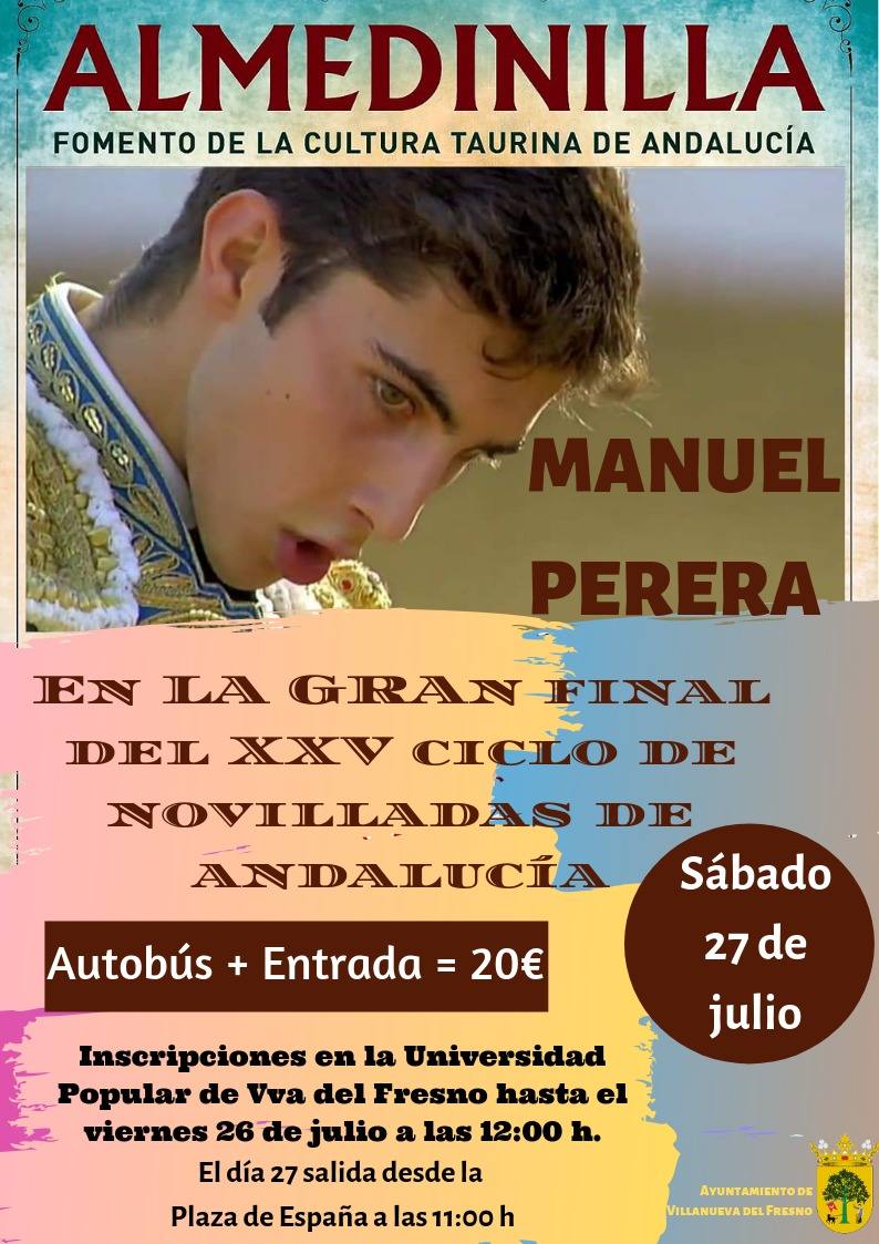 Todos los interesados en acompañar al novillero villanovense en la novillada del próximo sábado 27 de julio, se podrán inscribir en la Universidad Popular hasta el 26 de julio a las 12.00h, el coste de la entrada y el billete será de 20 euros por persona.