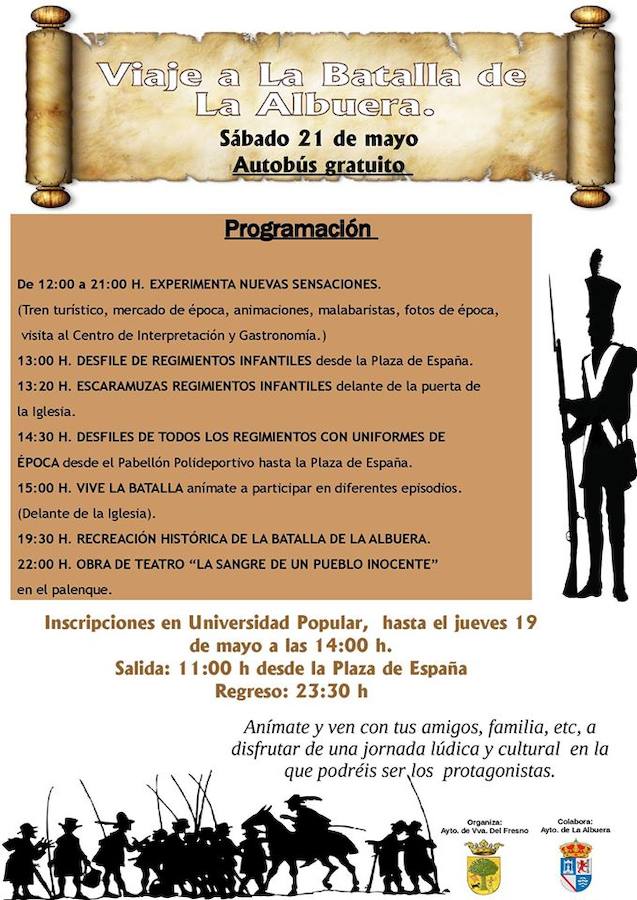 Los vecinos de la localidad que deseen asistir a los diversos actos conmemorativos de la Batalla de La Albuera que se celebran este sábado 21 de mayo, podrán inscribirse en la Universidad Popular de la localidad hasta el jueves 19 de mayo a las 14.00h, para conseguir su plaza en el autobús gratuito que para tal fin fletará el Ayuntamiento de la Albuera.