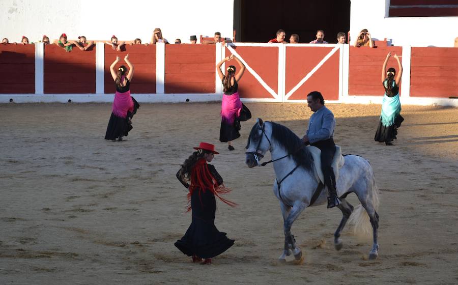 El espectáculo dio comienzo a las ocho de la tarde y tuvo hora y media de duración, en él las componentes de la Academia de baile de Badajoz, Puro Flamenco, interpretaron sevillanas y diferentes piezas de flamenco al compás de los caballos, además se pudo admirar la exhibición de doma clásica de alta escuela y doma vaquera con garrocha y pie a tierra. El ruedo presentó una afluencia de público de 250 personas.