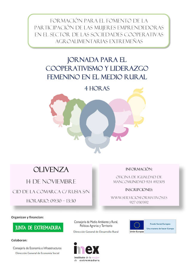 Este 14 de noviembre tendrá lugar la Jornada denominada "Cooperativismo y Liderazgo Femenino en el Medio Rural" en el CID de Olivenza con una duración de 4 horas. La jornada es gratuita y específica para mujeres, interesadas en la información y formación sobre el sector de las sociedades cooperativas agroalimentarias extremeñas