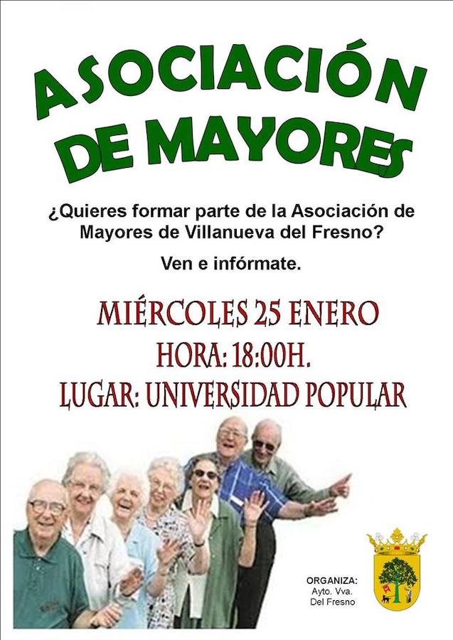 Con la intención de agrupar a las personas mayores del municipio, el Ayuntamiento va a crear una asociación, con la que impulsar actividades y eventos para este colectivo. Las personas interesadas en asociarse podrán asistir a la reunión informativa que se celebrará el próximo miércoles 25 de enero en las instalaciones de la universidad popular.