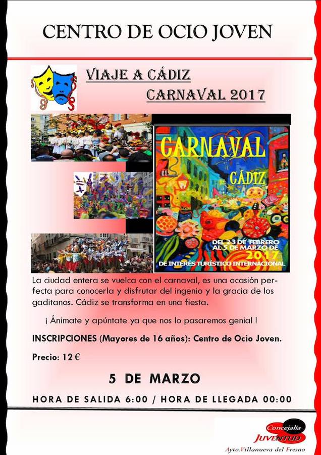 Desde el Ayuntamiento de la localidad y a través de la Concejalía de Juventud, se abre el plazo de inscripción para participar en la excursión con destino a Cádiz, con el fin de vivir el domingo de piñata del carnaval gaditano.