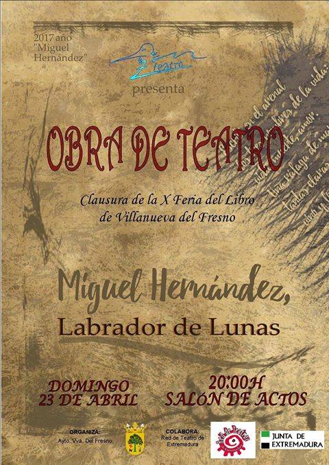 Dentro de la programación de la X Feria del Libro, este domingo día 23 de abril y en conmemoración al Día Internacional del Libro, el Ayuntamiento organiza la obra de teatro 'Miguel Hernández, Labrador de lunas' de la compañía Z-Teatro, la cual comenzará a las 20.00h en el salón de actos y tendrá la entrada gratuita.