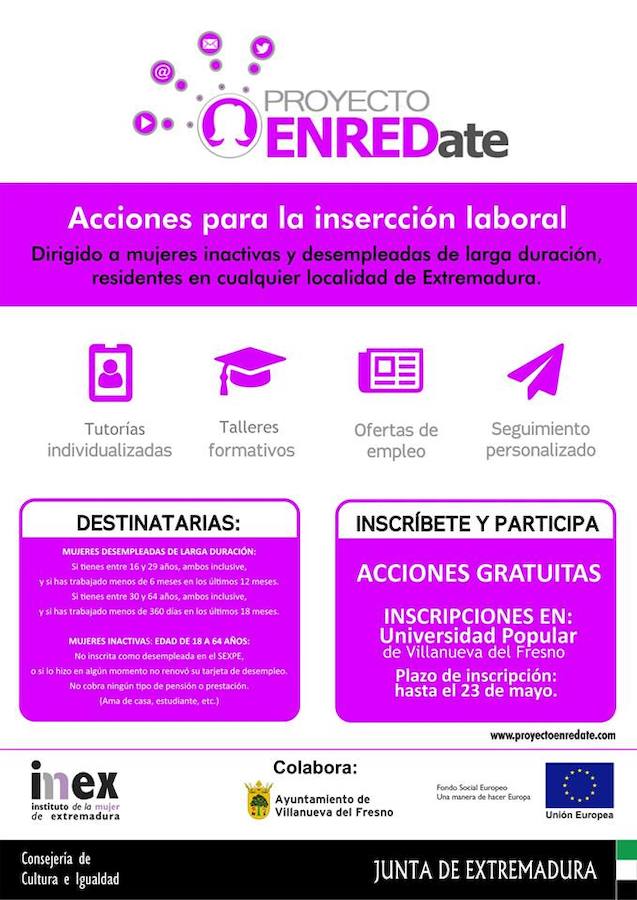 El proyecto ENREDate, es una iniciativa del Instituto de la Mujer de Extremadura, que pretende aumentar y mejorar el empleo femenino, con la adquisición por parte de las mujeres de habilidades en el ámbito de las nuevas tecnologías, las mujeres interesadas en él podrán inscribirse en la Universidad Popular.