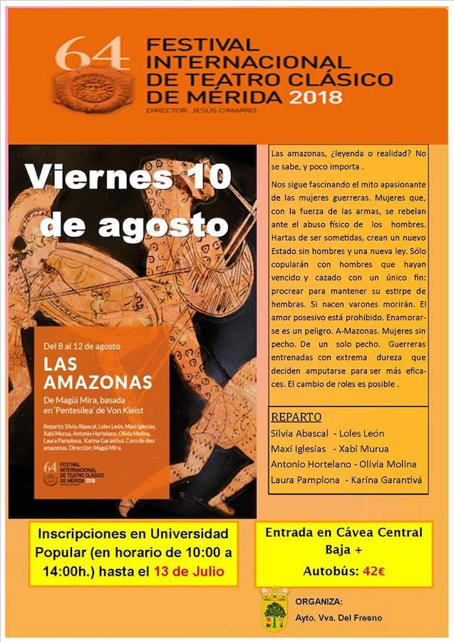La salida para asistir al Festival de Teatro Clásico de Mérida será el próximo viernes 10 de agosto, en ella se podrá presenciar la obra 'Las Amazonas' de Magüi Mira, basada en 'Pentesilea' de Von Kleist, el plazo de inscripción finalizará el 13 de julio