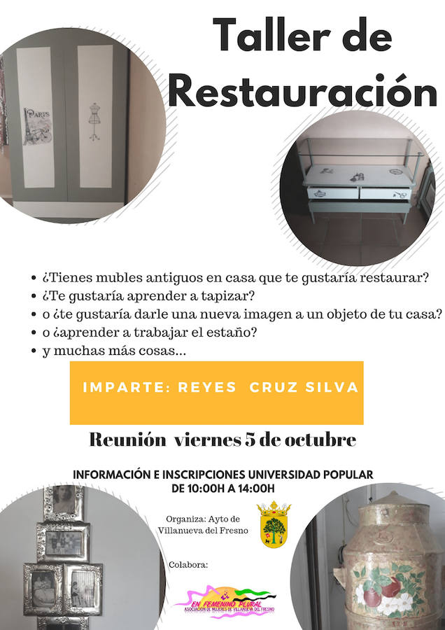 El Ayuntamiento de la localidad en colaboración con la Asociación de Mujeres 'En femenino Plural', organiza un taller de restauración que será impartido por Reyes Cruz Silva.