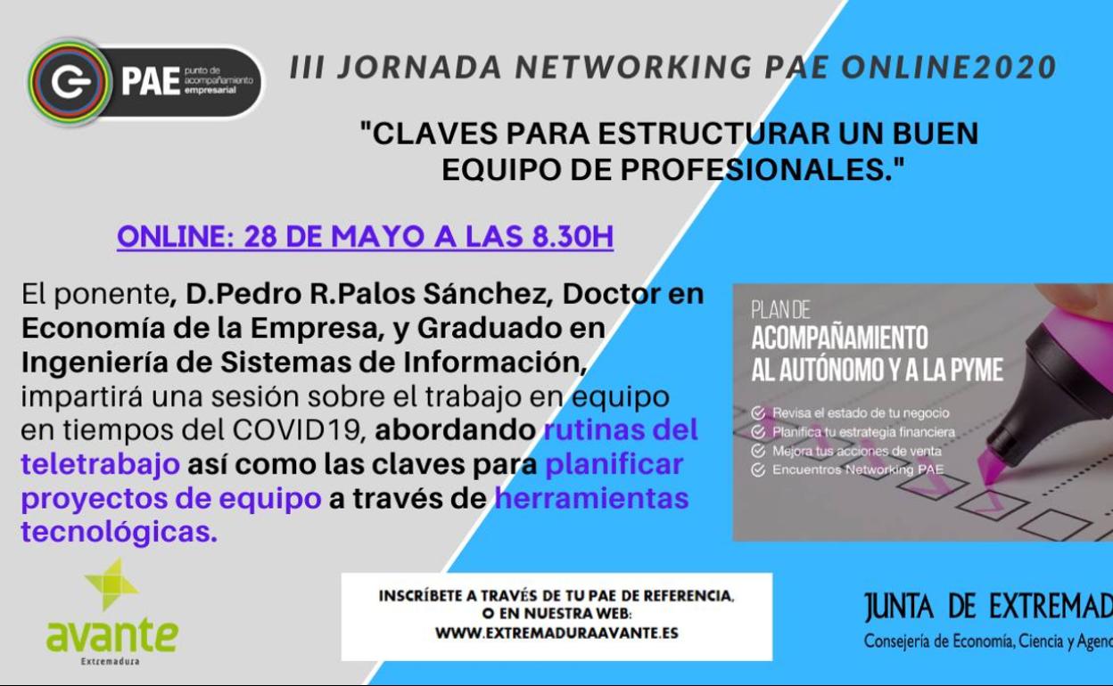 Extremadura Avante, a través de la red de Puntos de Acompañamiento Empresarial (PAE) continuará, el próximo jueves, 28 de mayo, con la celebración de ... la III Jornada Networking PAE 2020, en las que se abordan las claves para estructurar un buen equipo de profesionales.