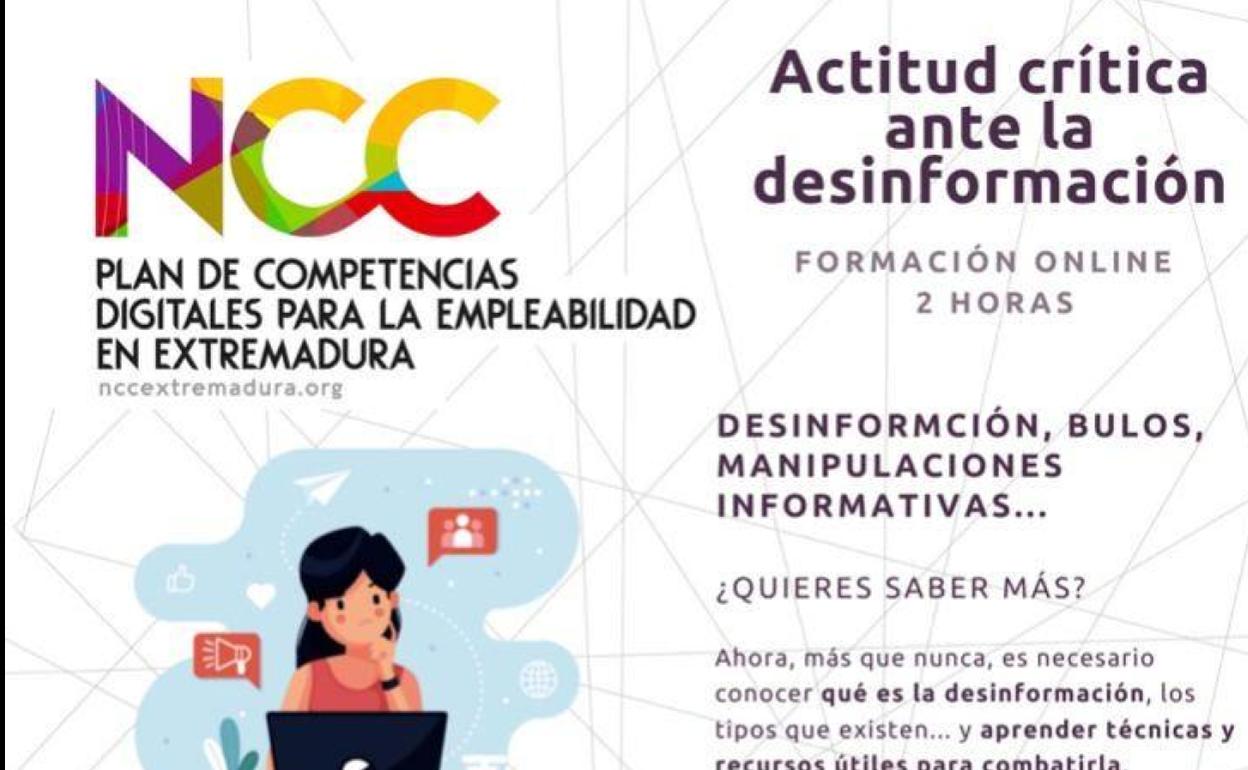 Además, habrá una sesión informativa sobre 'Actitud crítica ante la desinformación'. Formación online de dos horas de duración con la que se analizarán aspectos sobre la desinformación, bulos, manipulaciones informativas, etc.